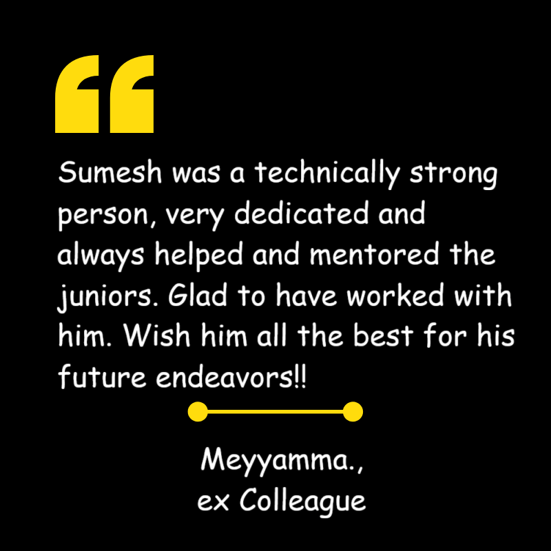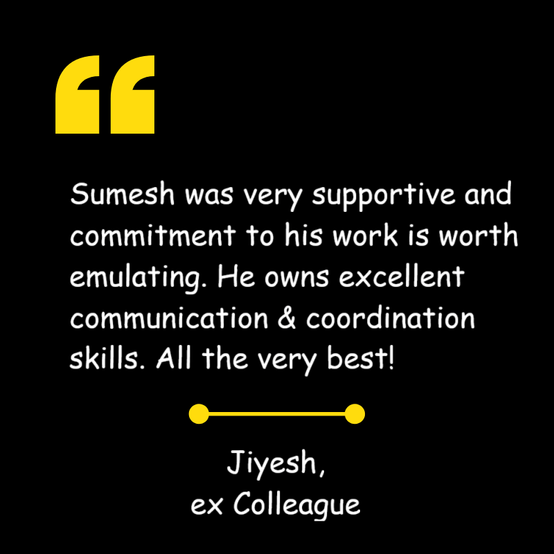 Meet Sumesh, A Senior Manager , Coach And Content Creator. He Helps Working Professionals To Start And Scale through the corporate ladder . With An Impressive Career spanning over 20 years and helping so many across the years, Sumesh Has Not Only Built A Strong Online Presence But Has Also Transformed The Lives Of several Individuals Through His Expert Training And Guidance.